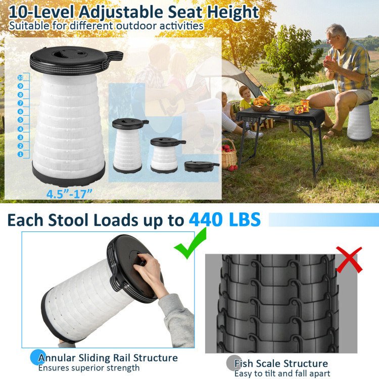 4.Adjustable Height and Unique Design: The seat height can be adjusted in 10 levels from 4.5"-17", which is suitable for different outdoor activities. And in contrast to other fish scale structure that is easy to tilt and fall apart, this stool adopts an annular sliding rail structure, ensuring superior strength. And each chair can load up to 600 lbs.