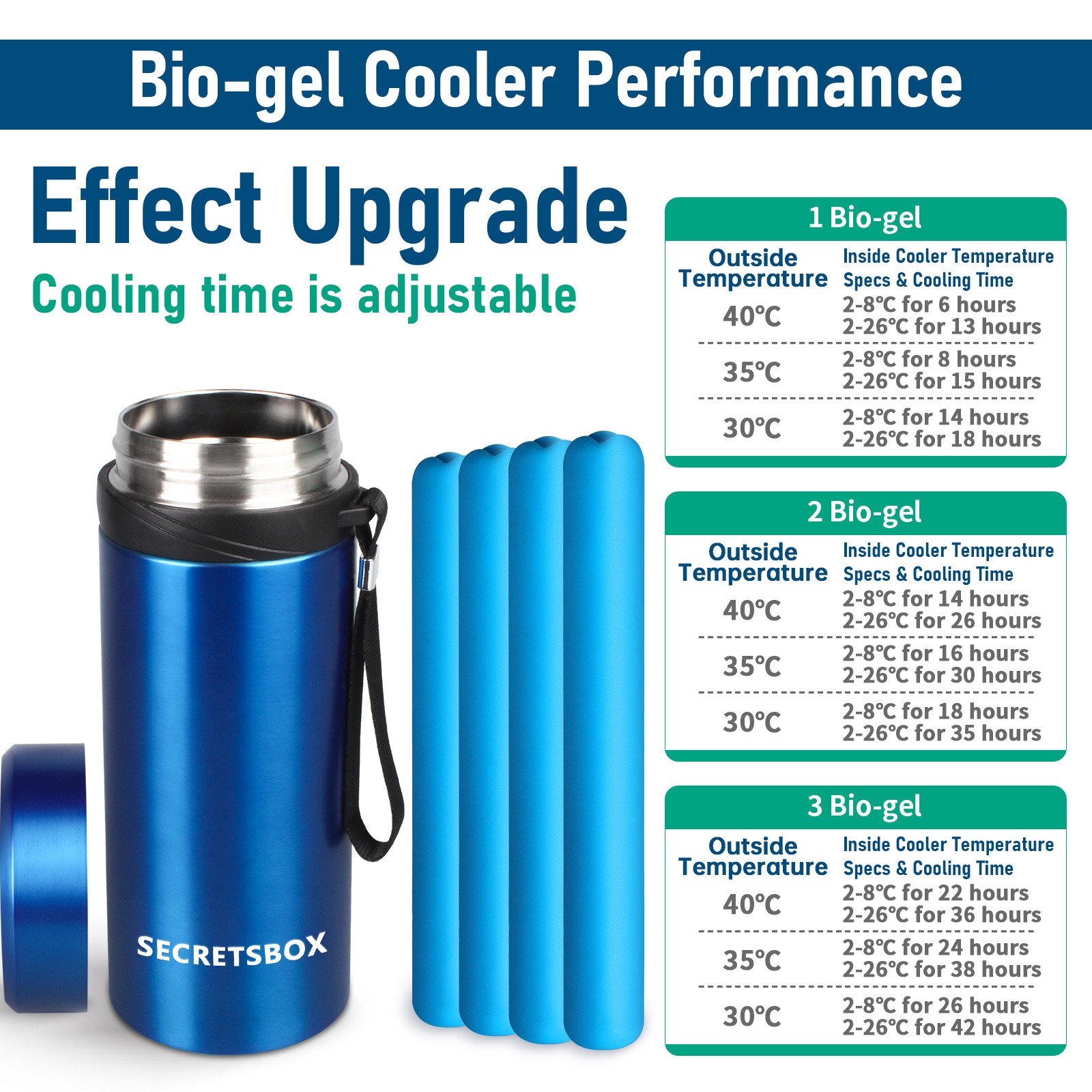 304 stainless steel cup body, food grade PP material, internal high vacuum design, used with natural bio-gel cold storage bottle, can provide 2-8 °C (36-46°F)for up to 22-36 hours under ultra-high temperature environment 104 °F to ensure drug safety.