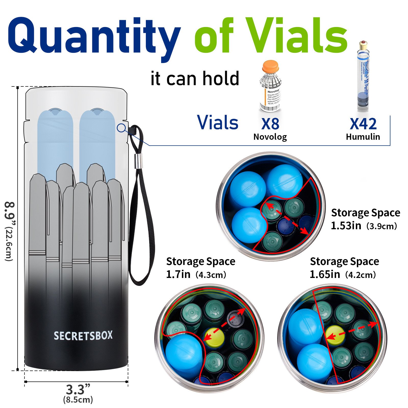 3.Storage space: it's enough to stroe vials x8pcs Novolog or x42pcs Humulin