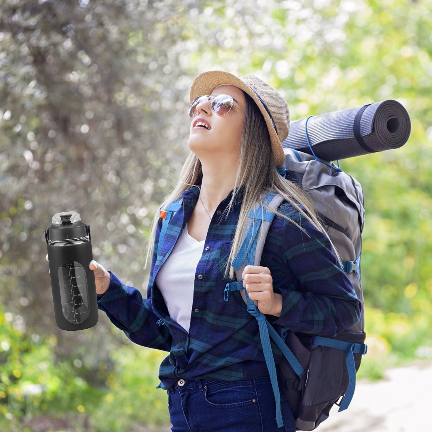 Are you tired of forgetting to stay hydrated throughout the day? Look no further than our motivational water bottle! Comes with timer markers and and precise volume on the side, helping you track your water intake with ease. With its large capacity(32Oz or 64 Oz), you can refill the sports water bottle up less frequently and keep yourself refreshed all day long. Made of high borosilicate glass, suitable for both warm and cold beverages, heat-resistant, dishwasher safe and healthy to use. Slip resistant with silicone sleeve and easy to carry with a built-in handle. And for added convenience, it features a built-in straw, making it easy to drink water on the go. Plus, its stylish design and motivational messages will inspire you to keep pushing towards your health goals. So why wait? Invest in our water intake tracker bottle today and take the first step towards a healthier, happier you!
